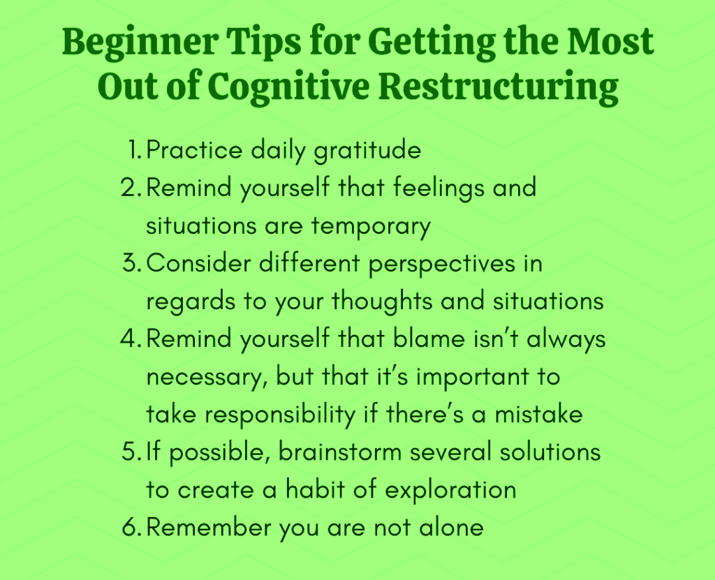 Although anyone can use cognitive restructuring techniques to improve their thinking habits, many people find collaborating with a behavioural therapist helpful.